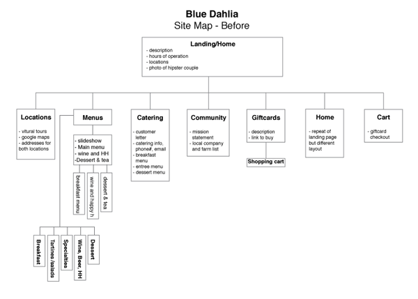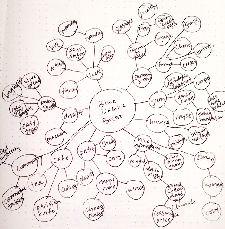 I started my process by researching the history of Blue Dahlia, interviewing clients, a site analysis, competitor research, S.W.O.T Analysis and a word list.