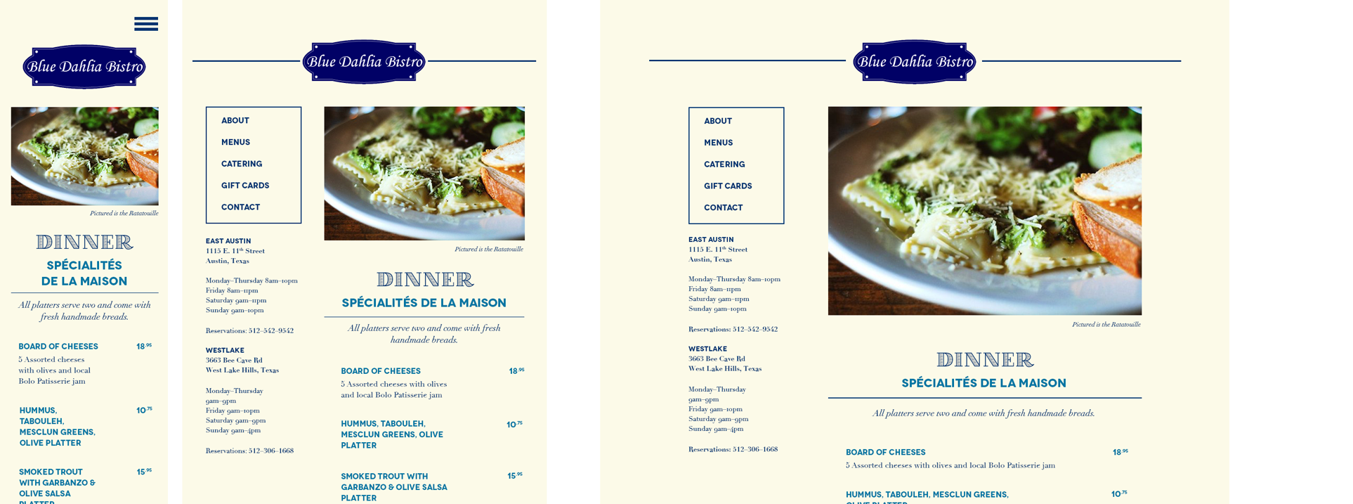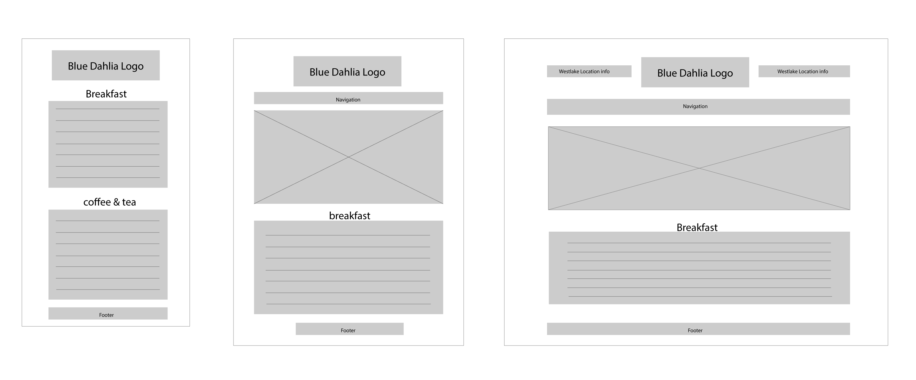 After gathering information about the content and figuring out the new structure, I created wireframes for 3 media queries to explore layouts. The layout below worked well because it allowed space for large photos of food throughout the site.