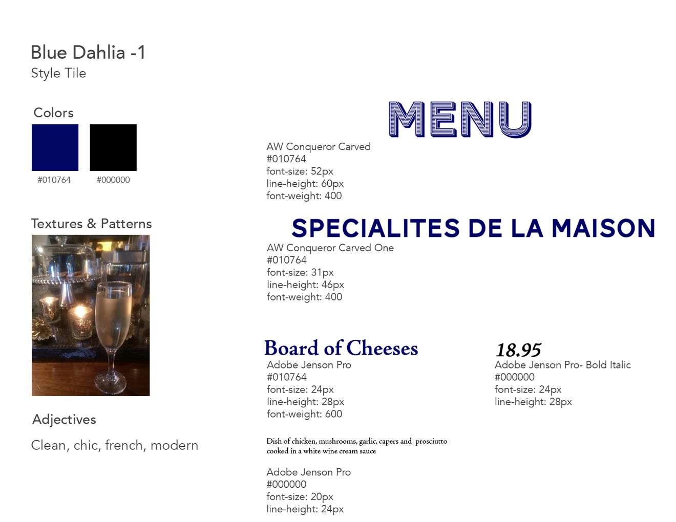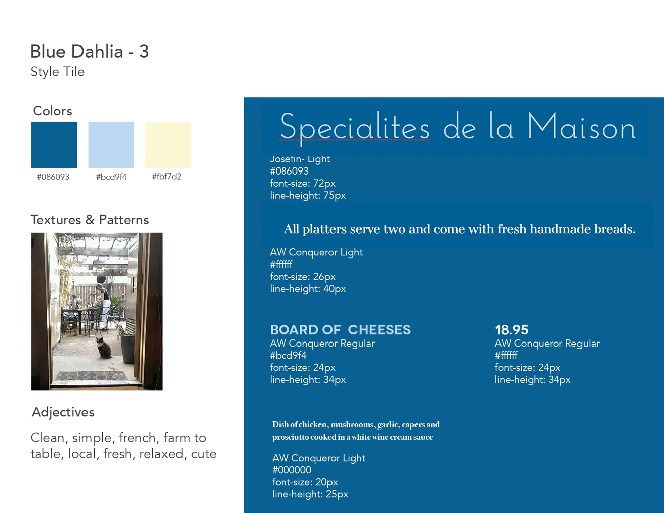 I created a few style tiles to explore different type and color options. I used the typefaces from one style tile and the color palette from another to use color and type to evoke a cool and casual feel for the site.